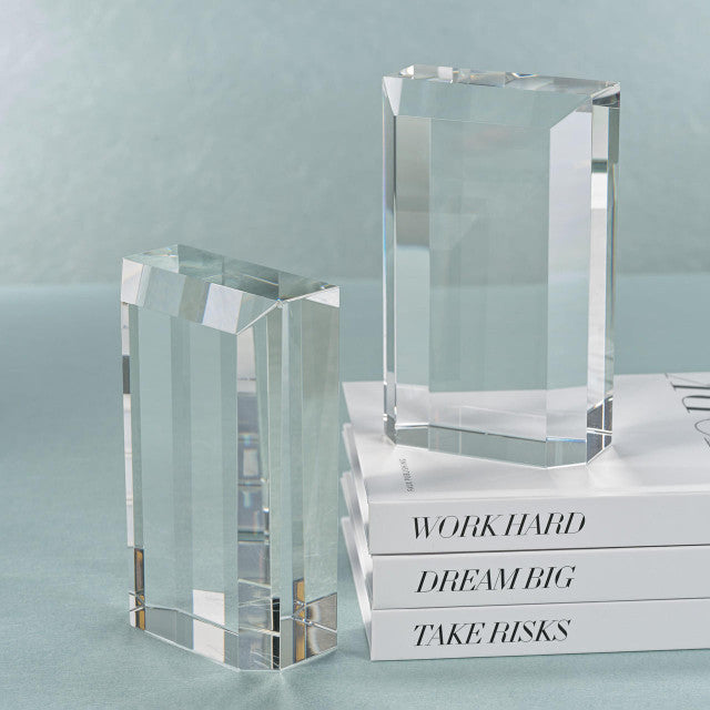 Transform your bookshelf into a showcase of refinement with our Crystal Glass Book Ends. Let the beveled rectangle shape, crystal clear finish, clean straight lines, and weighty presence redefine your space, combining practicality with a touch of artistic flair. Elevate your home decor and literary collection with this exquisite set.
