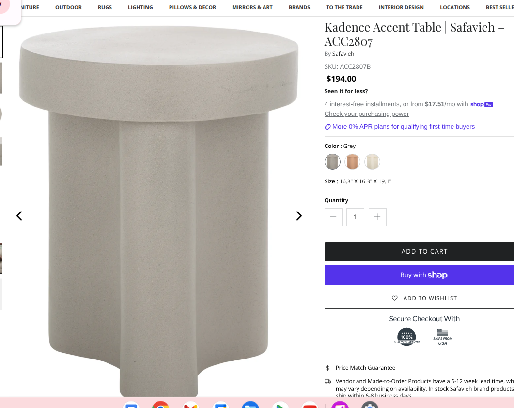 At this time, our larger products (furniture, upholstery, lighting, mirrors & wall art, etc.) are available for in-store pickup only.