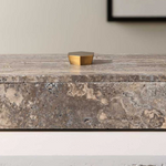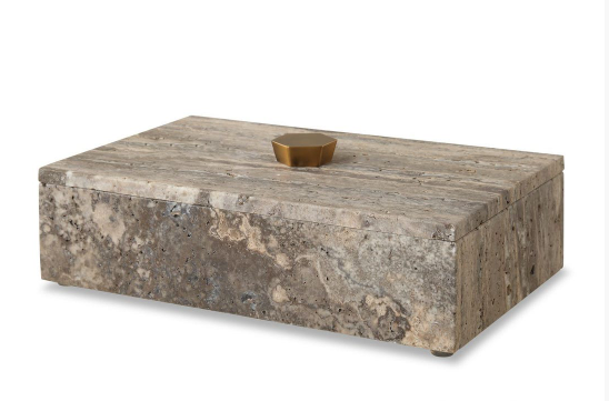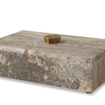 Need an elegant hide away to stash small items? This gray unfilled travertine box with bronze handle and lift-off lid is the perfect spot. Because it is a natural stone, each piece of travertine is unique.