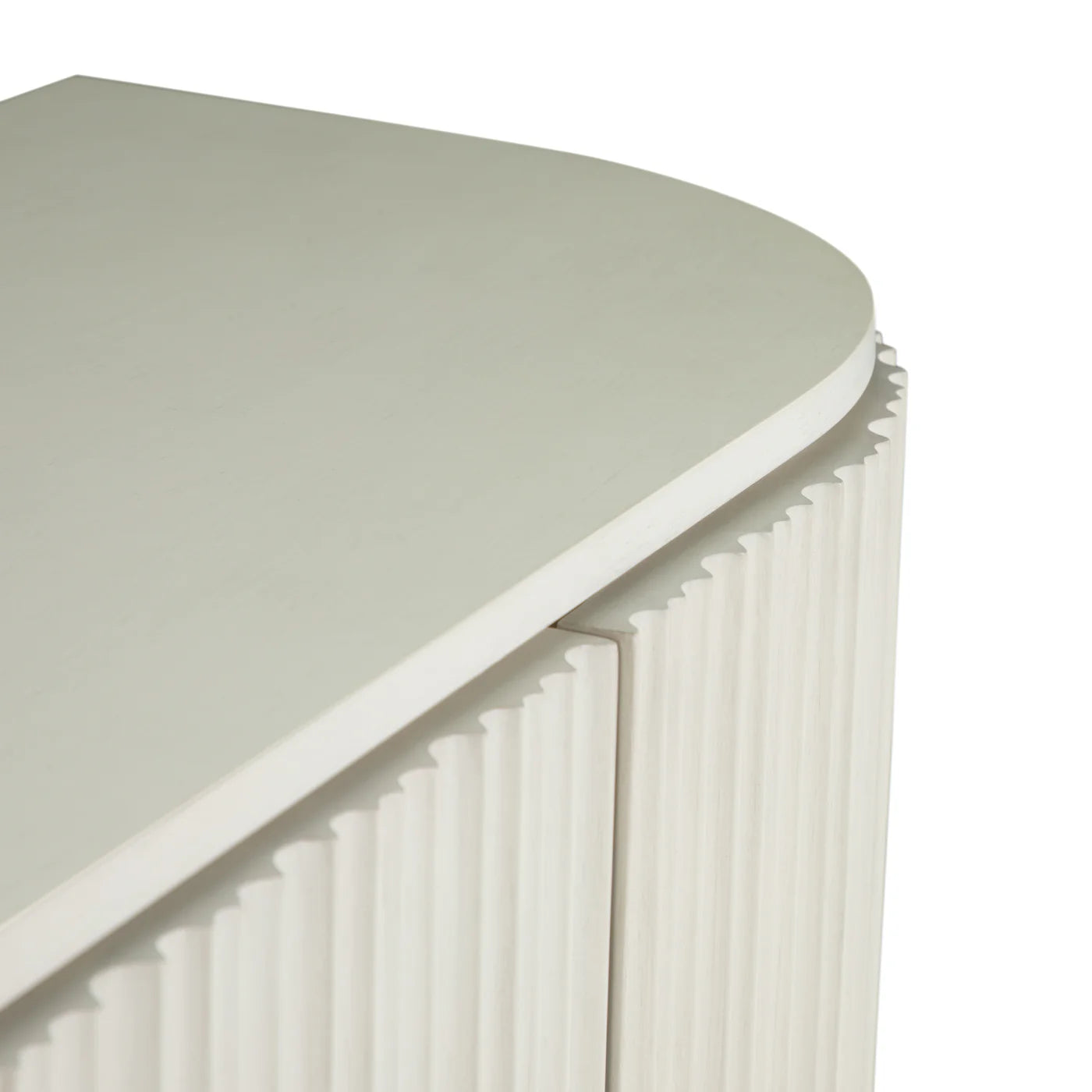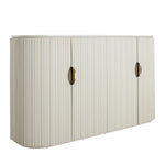 The Isadora Sideboard offers a modern design that stands out with its variable fluted patterning creating a dynamic and textured appearance This patterning combined with the sideboard's crisp edges and brushed white finish curates a fresh and bold aesthetic The top of the sideboard is adorned with the same sesame white finish adding a touch of elegance and luxury Beneath minimal brushed brass handles provide a sleek contrast enhancing its contemporary appeal Rounded sides soften the overall look making the Isadora Sideboard a perfect blend of modern style and soft sophistication ideal for adding a statement piece to any living space