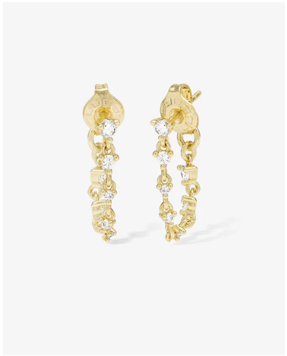 The Not Your Basic Soft Hoop Earrings offer a contemporary take on the classic gold hoop. Inspired by our best-selling collection, this delicate design is part stud, part chain, and all effortless style. The 33mm length features a thin chain link adorned with staggered simulated diamonds, creating extraordinary, light-catching dazzle. Crafted in luminous 18k gold plating, these hoops add a modern aesthetic and subtle movement that instantly elevates your everyday look.