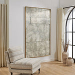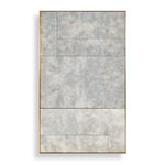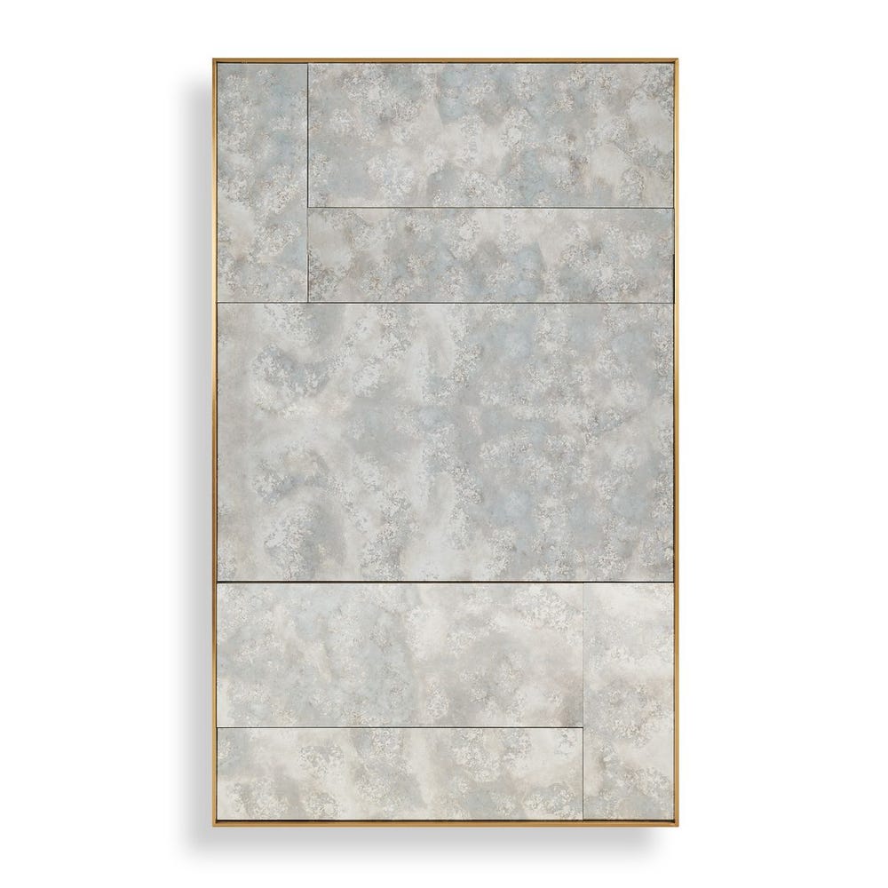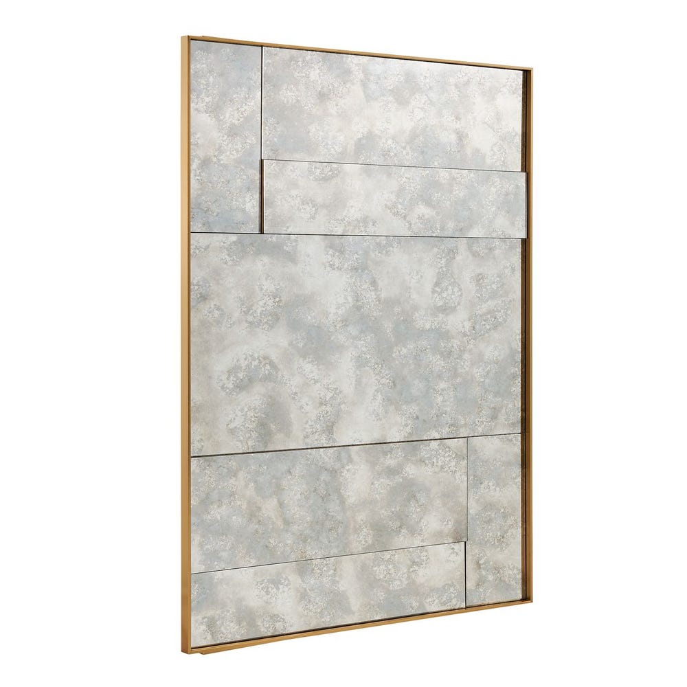 The Rally Mirror features pieced together antique style mirrors, encased in a refined stainless steel frame finished in a plated antique brass. May be hung horizontal or vertical on a metal cleat, provided.