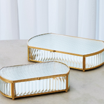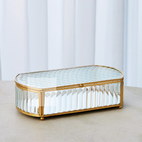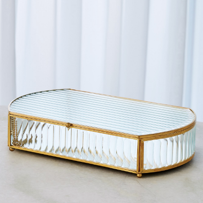 Inspired by 1920's dresser sets, The Reeded Glass Oval Box is made with carved glass, a chain catch and brass ball feet construction. Perfect place for your trinkets or jewels.