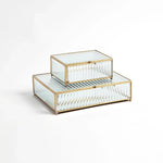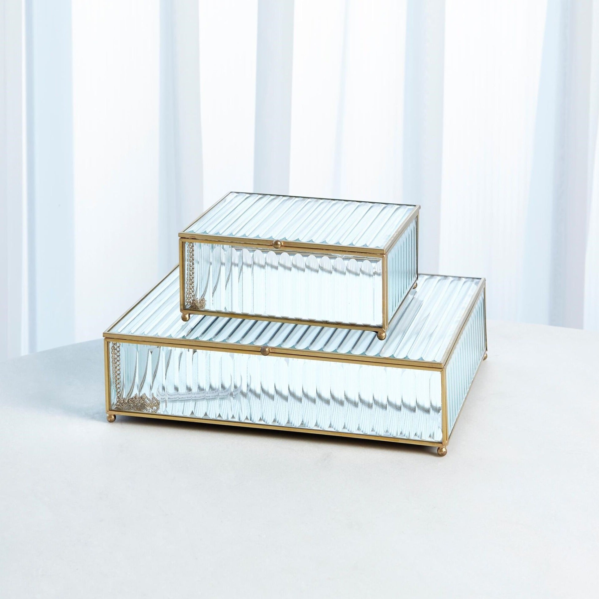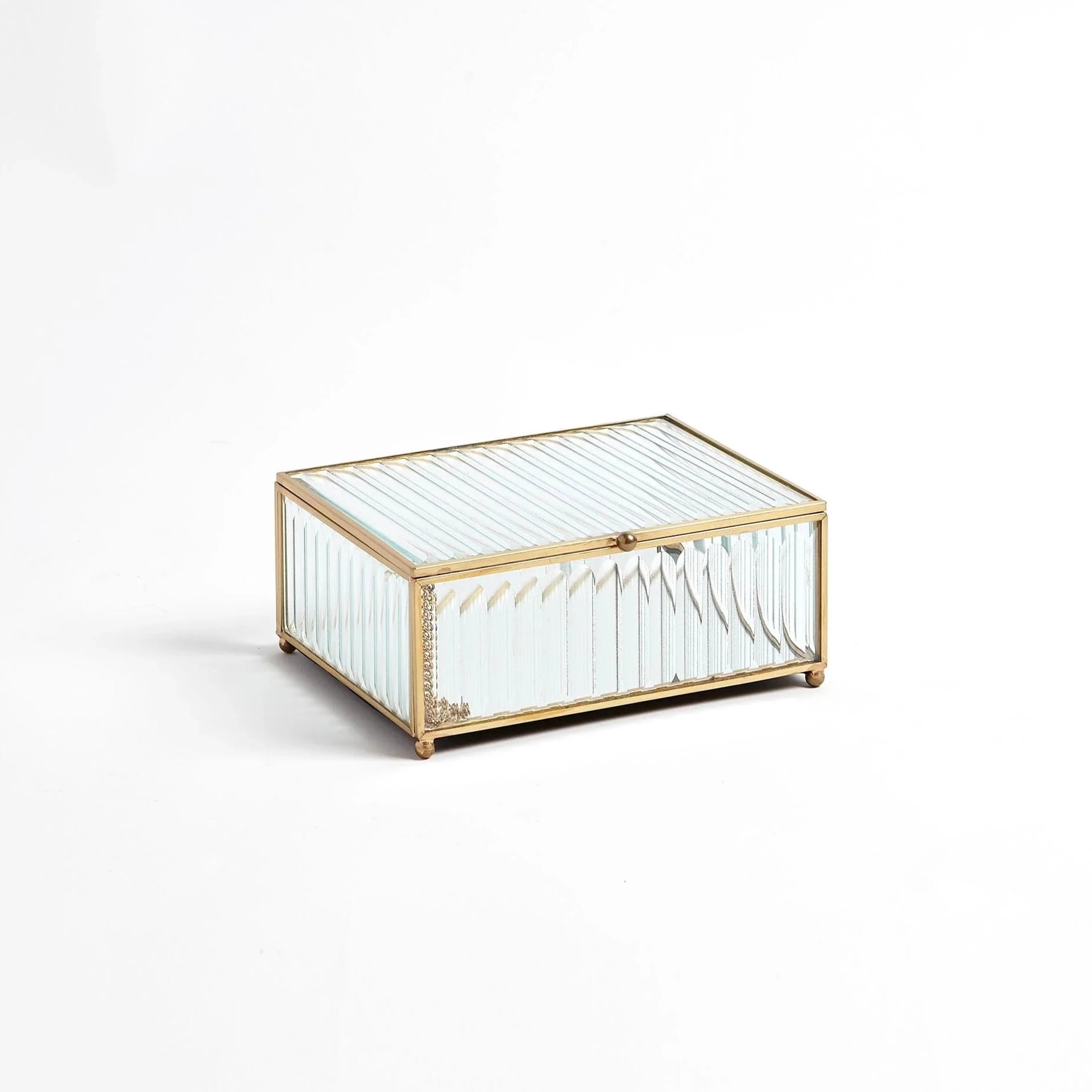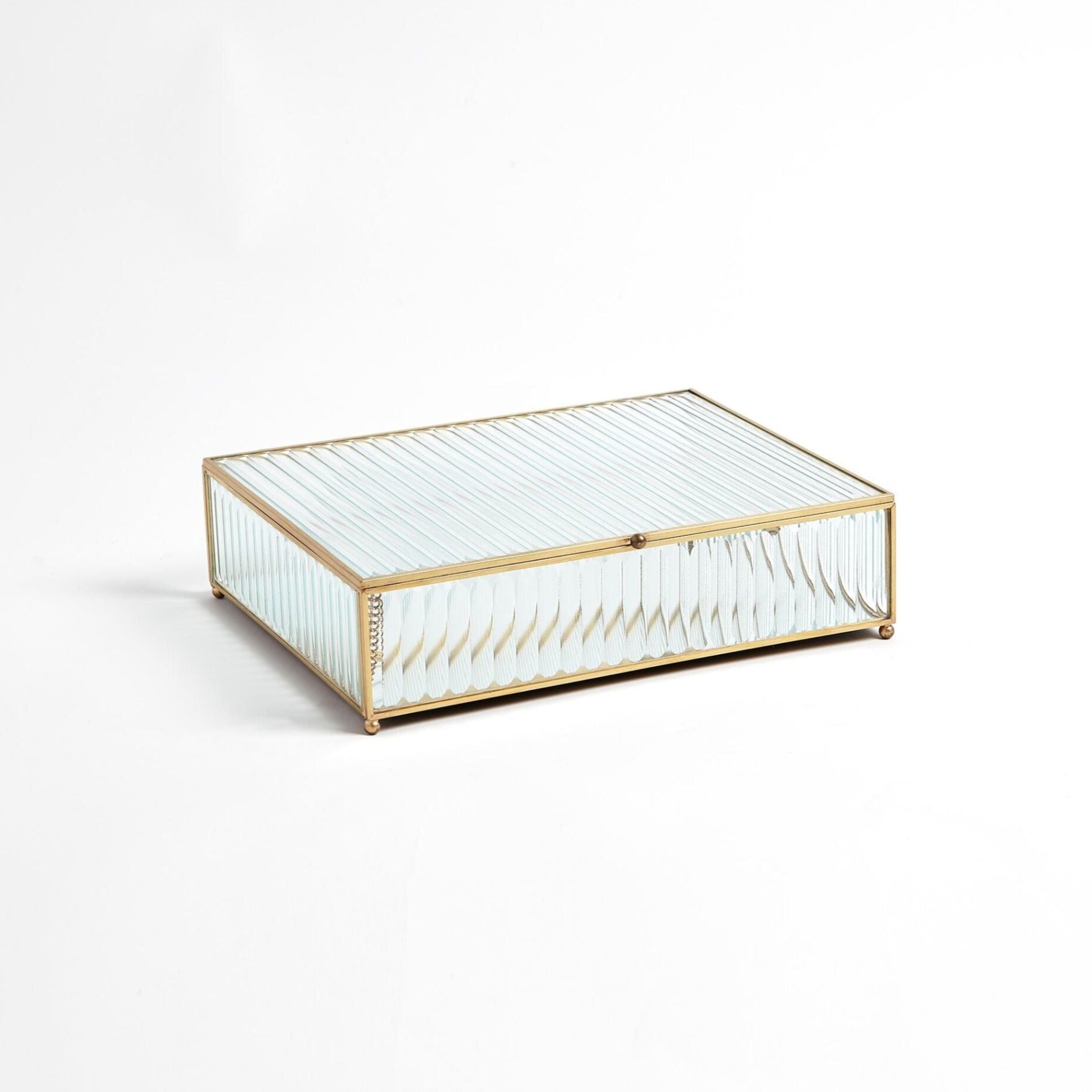 Our Reeded Glass Boxes feature brass finished metal trim crafted from thick, reeded clear glass.
