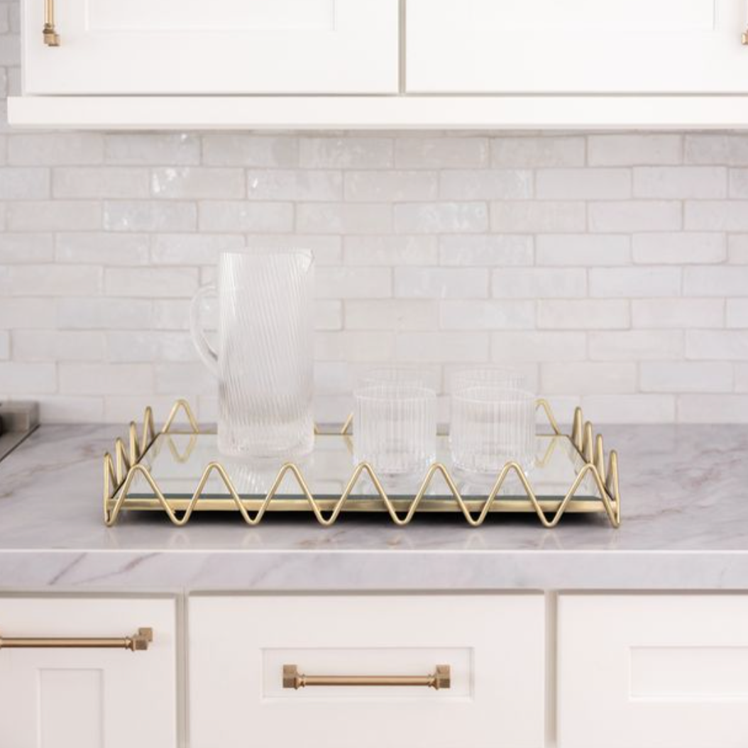 Scalloped trim on the dress of designer Ashleys childhood doll, inspired our Ric Rac Tray. Both modern and nostalgic at the same time, this brass tray design is accented with a subtle antiqued mirror surface. A chic addition to any tabletop.