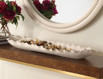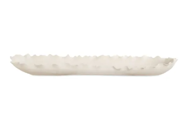 A striking elongated bowl with delicately ruffled edges, reminiscent of ocean waves or mountain ridges. Its fluid form and elegant matte white finish make it a captivation centerpiece, blending organic beauty with modern sophistication.