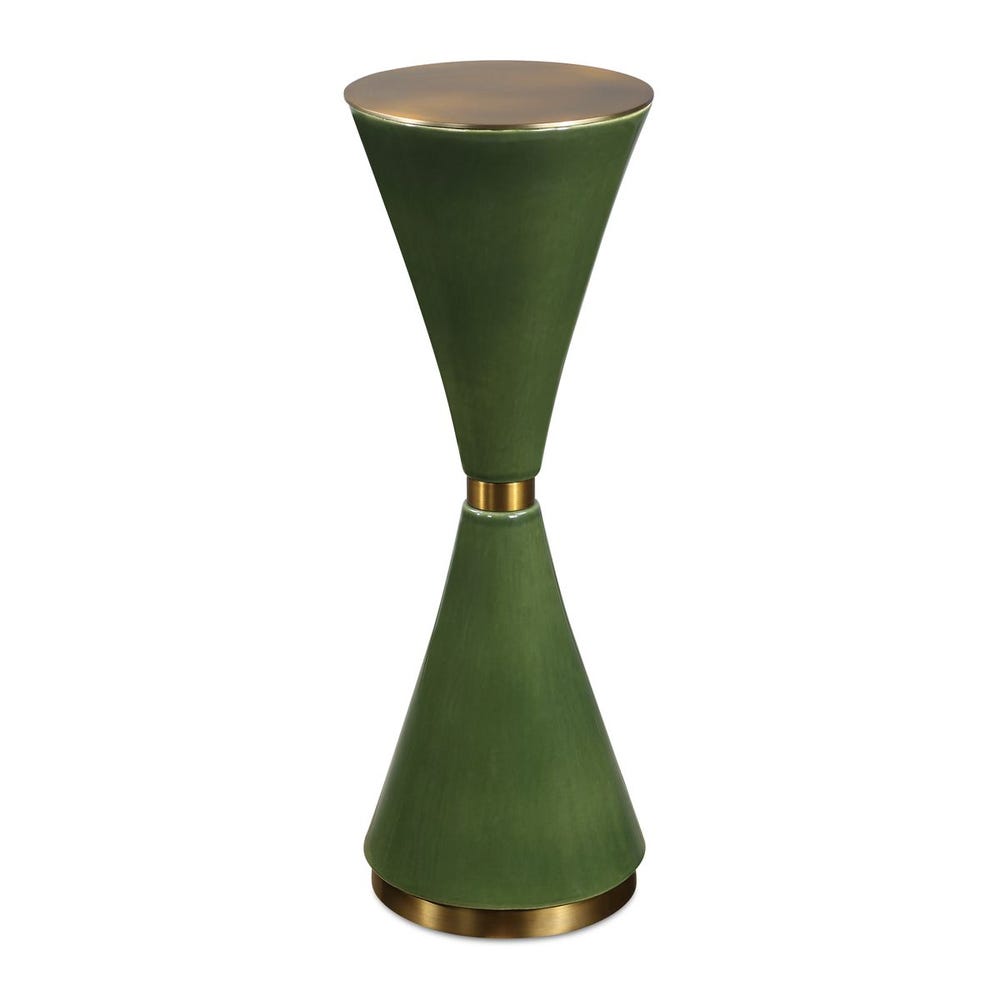 This striking ceramic drink table showcases a captivating hourglass silhouette in a rich jade green glaze, accented by brass plated iron details.
