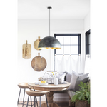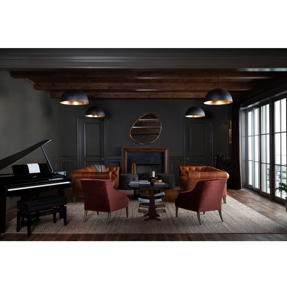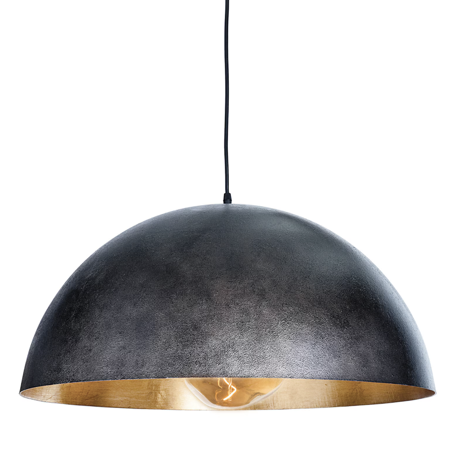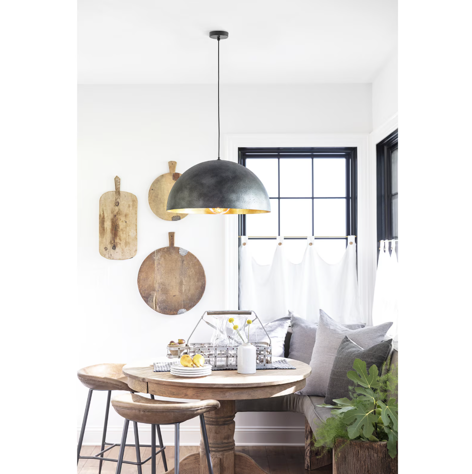 A simple dome shade brings sleek minimalism to the mix. Featuring a gold-leafed finish on the shade’s interior, this gives the room a warm glow and a sophisticated pop of contrast.