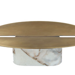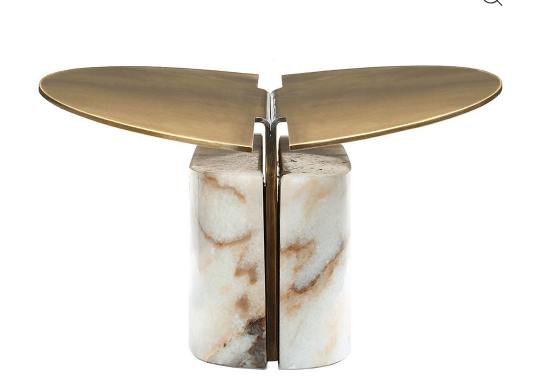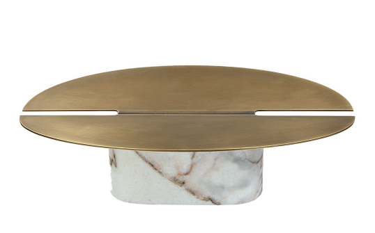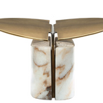 Two matte brass-finished, flat metal demilune sheets are held in place with a base made of honed off-white marble with chocolate and black veining. The flattened brass top is the perfect display for treasured items or is impressive as a stand alone sculpture.