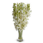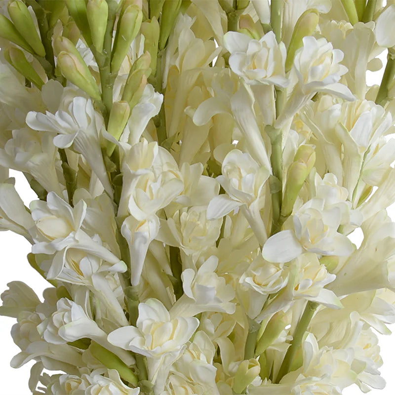 You may miss their distinctive scent, but everything else about this reproduction Tuberose arrangement will make you believe they are fresh cut. We gather twelve lifelike stems with pale green buds and creamy white open flowers. Each artificial stem is full of blossoms and are secured in our heavy, mouth-blown hourglass shaped clear glass vase with permanent acrylic solution that looks like water.