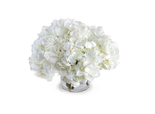 This bountiful arrangement of lifelike Hydrangeas looks fresh-cut from your garden. Large Hydrangea flowers are cut and arranged by hand in our facility in North Carolina and set in glass in a clear acrylic solution that looks just like water.
